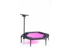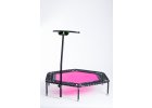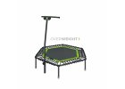 - Stützgriffe: diese sind aus einem runden Stahlprofil mit einer Seitenbreite von 2 mm. Der Stützgriff besteht aus drei Teilen, welche – genauso wie der Rahmen des Trampolins – mit Hilfe von Verbindungstücken zusammengesetzt werden. Ein Vorteil der Stützgriffe ist die variable Einstellbarkeit nach der Größe des Springenden. Die Halterung der Stützgriffe ist fest zum Trampolin befestigt, wodurch eine tolle Stabilität des Trampolins gewährleistet ist. Der untere Teil der Lenkstange ist aus rostfreiem Stahl. Dank diesem Material kommt es zu keiner unansehnlichen Abschürfung.
